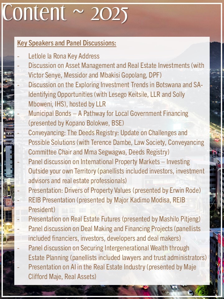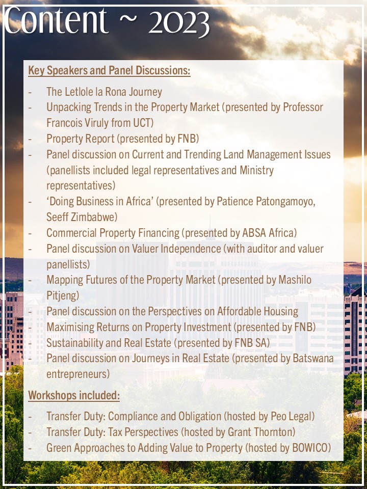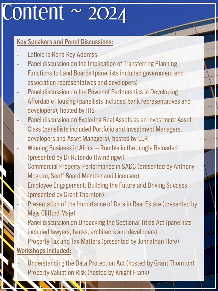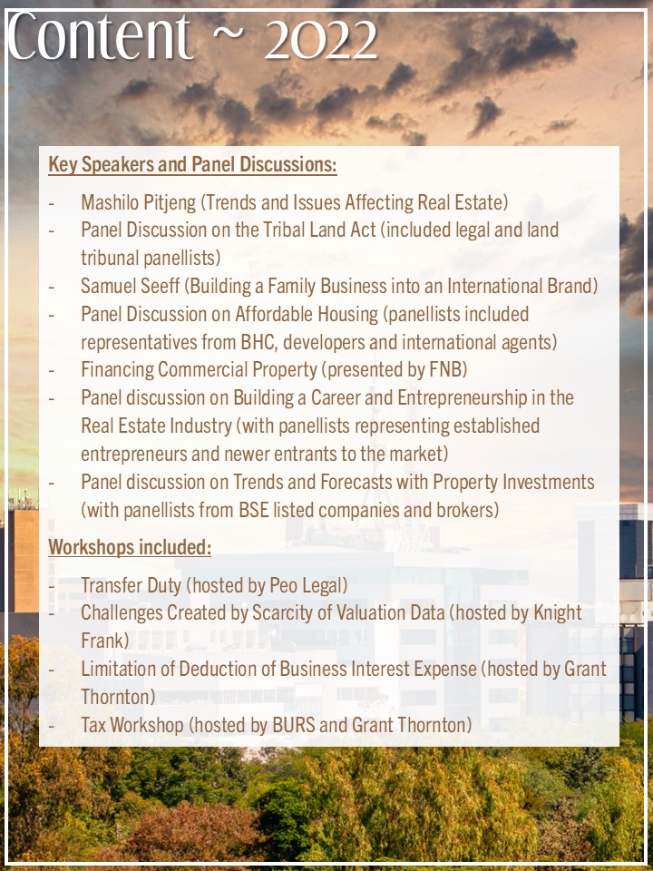 This is a fantastic opportunity for delegates to interact with key industry players and immerse themselves in all things real estate. The content is compiled to ensure that delegates are exposed to a multitude of real estate topics and presented in an engaging manner. With a combination of presentations, discussion panels, workshops and an expo, there is a whole day of engaging content.