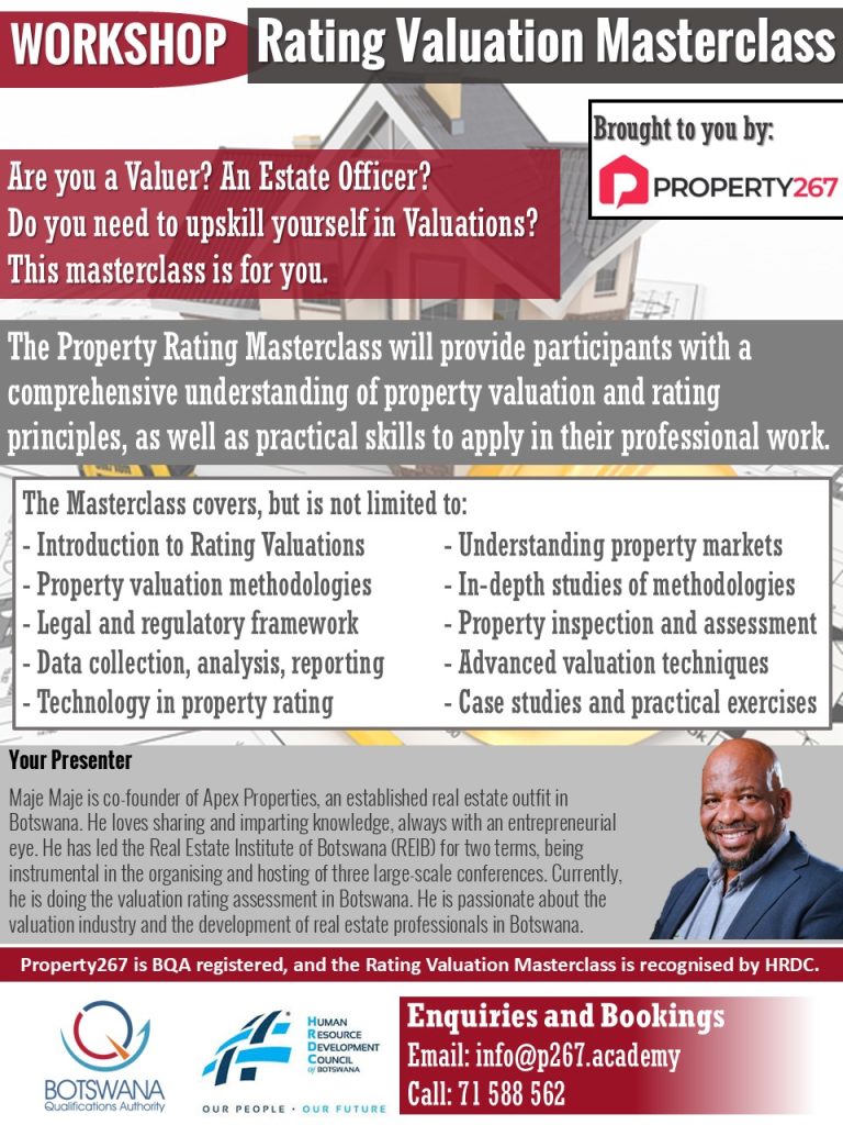 The Rating Valuation Masterclass is an advanced training program designed for valuers, estate officers, and real estate professionals seeking to deepen their expertise in property valuation and rating. This intensive workshop provides a detailed understanding of valuation methodologies, legal frameworks, and the use of technology in property rating. Participants will gain practical knowledge on data collection, analysis, and reporting, as well as hands-on skills in property inspection, assessment, and advanced valuation techniques. With guidance from seasoned industry experts, the masterclass emphasizes both theory and real-world application, including case studies and practical exercises. Recognised by BQA and HRDC, the program ensures participants not only strengthen their professional competence but also contribute to enhancing standards within Botswana’s property industry. Whether you aim to refine your skills, improve accuracy in valuation, or align with industry best practices, this masterclass is your pathway to excellence.